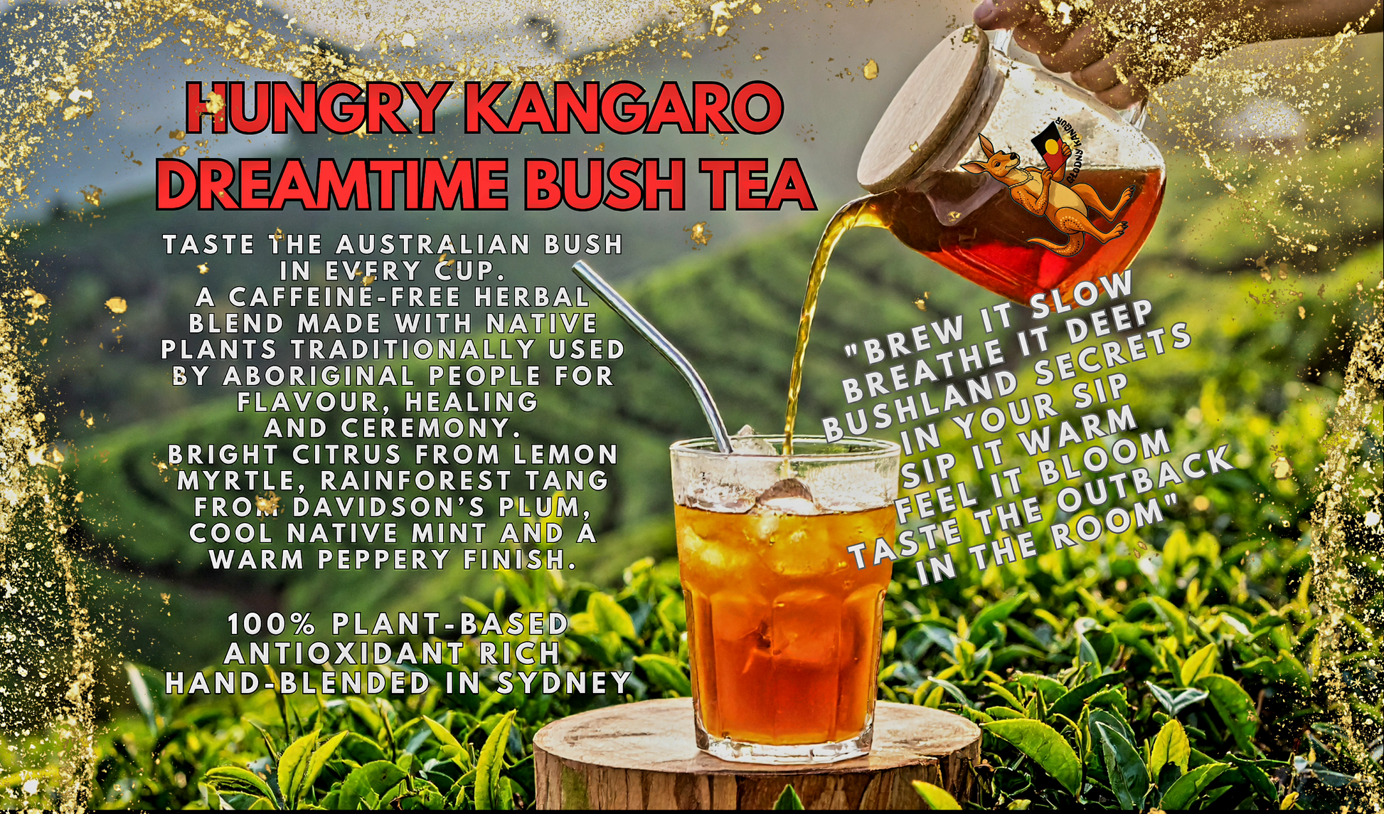 Hungry Kangaroo Bush Tea is a handcrafted blend of lemon myrtle, Davidson’s plum, lemon eucalyptus, native mint (river mint) and mountain pepper leaf, creating a fresh, aromatic and naturally vibrant infusion.